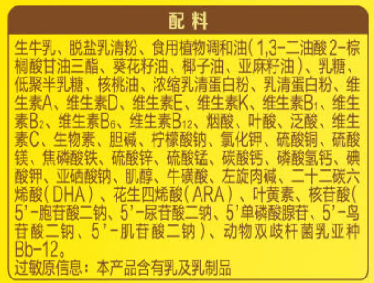 奶源方面,新国标飞帆采用飞鹤在国内自控牧场的奶源,1段使用鲜奶作为奶基原料生产,2段之后在鲜奶的基础上,加入了乳粉。对比鲜奶,乳粉的加工工序更加繁琐,而且可能经过一段时间的储存运输,所以奶粉的新鲜度和营养保留度都有所欠缺。
