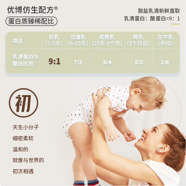 与众不同的是,优博瑞慕奶粉的乳清蛋白与酪蛋白的比例按照母乳初乳的9:1比例来生产。这一比例的选择有助于更好地消化蛋白质。相比市场上绝大多数奶粉按照母乳成熟乳的比例6:4来生产,优博瑞慕奶粉的乳清蛋白与酪蛋白比例的独特性非常罕见。这样的配方设计有助于宝宝更好地吸收和消化蛋白质,提供充足的营养支持。