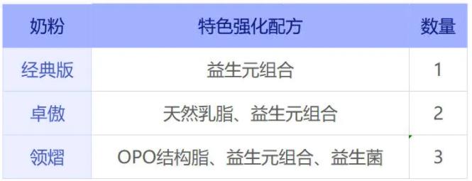 另外,在特色强化配方这块,3款奶粉都有添加益生元组合,除此之外,卓傲还加入了天然乳脂,领熠则是加入了OPO结构脂和益生菌。益生元组合和益生菌都是有助平衡肠道菌群,维护肠道健康。天然乳脂和OPO结构脂的功效很接近,都是可以优化钙和脂肪酸的吸收,还可以软化便便,降低便秘几率。