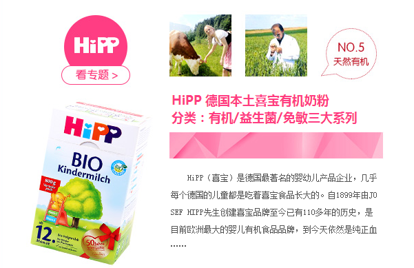 德国的喜宝品牌自1899年JOSEF HIPP先生创建,至今已有110年的历史了。涉及母婴的食品、用品、玩具等许多领域。早在1956年,喜宝品牌的经营者就成为了全球天然生物食品的先锋,该奶粉不含面筋蛋白(Gluten Free.It Gesetz)。他们开始尝试在不含化学肥料的农庄的土地上种植水果和蔬菜,放养乳牛。