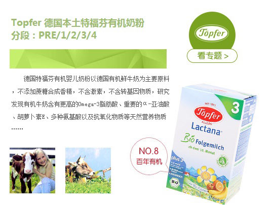 德国特福芬有机婴儿奶粉以德国有机鲜牛奶为主要原料,不添加蔗糖合成香精,不含激素,不含转基因物质,研究发现有机牛奶含有更高的欧米茄3脂肪酸,重要的阿尔法亚油酸和胡萝卜素E和多种氨基酸以及抗氧化物质等天然营养物质。德国特福芬有机婴儿奶粉添加活性益生菌,提高宝宝免疫力,有效抑制有害菌的增长,改善宝宝肠道的消化环境,有效解决了宝宝便秘、腹泻、吐奶、拒食、腹胀等肠道问题的困扰。