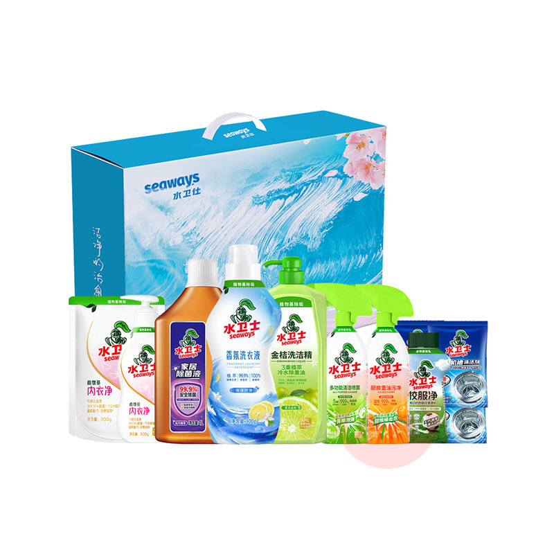 植物基内衣净300g(袋装)+内衣专护洗衣液300g+家居除菌液1L+香氛洗衣液(海洋柠香)900g+金桔洗洁精1.35kg+多功能清洁喷雾500g+厨房重油污净500g+校服净340g+洗衣机槽清洗剂125g*4袋