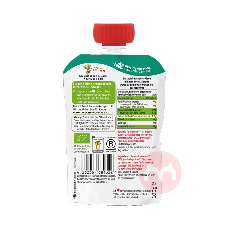【59.9任选6件】Fruchtbar 德国Fruchtbar苹果草莓胡萝卜红甜菜吸吸乐 100g 6个月以上 海外本土原版